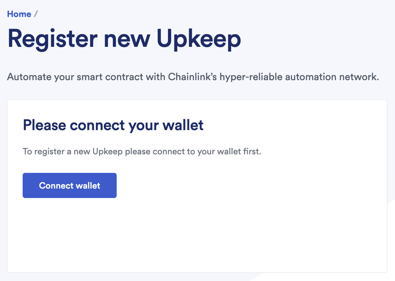 If you do not already have a wallet connected with the Chainlink Automation network, the interface will prompt you to do so. Click the Connect Wallet button and follow the remaining prompts to connect your wallet to one of the Automation supported blockchain networks.
