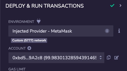 3. Click on Connect. The RemixIDE environment should be set to the correct environment, and the account should be the Ganache account.