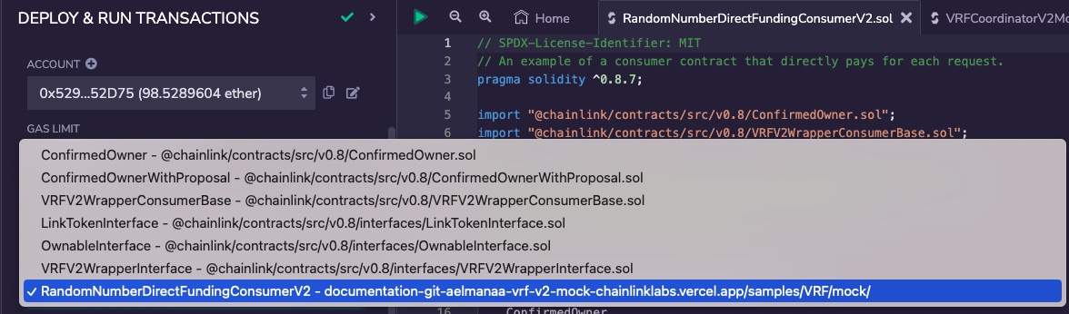 2. Under DEPLOY & RUN TRANSACTIONS, select RandomNumberDirectFundingConsumerV2.