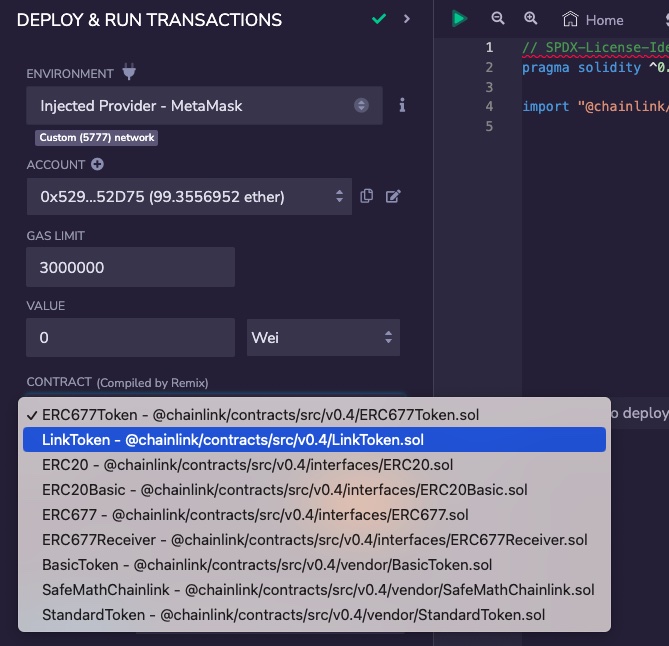 3. Under DEPLOY, click on transact to deploy the LinkToken contract.