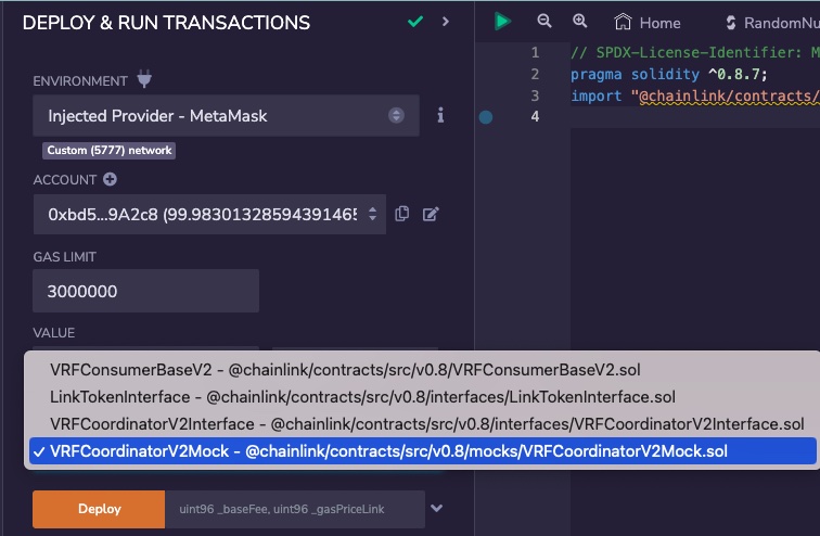 2. Under DEPLOY & RUN TRANSACTIONS, select VRFCoordinatorV2Mock.