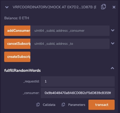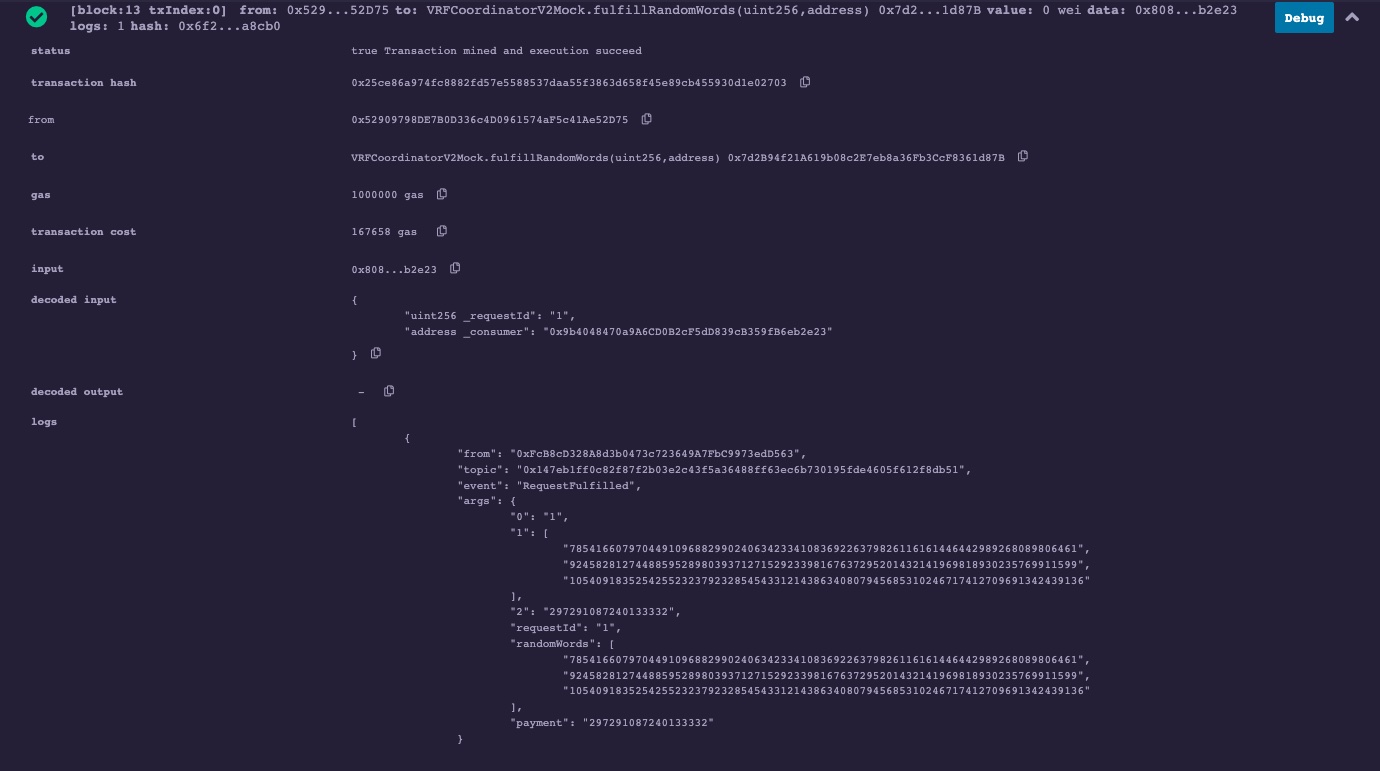 11. Call the VRFCoordinatorV2Mock fulfillRandomWords function to fulfill your consumer contract request.