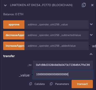 2. Click on transfer and fill in the _to with your consumer contract address and _value with LINK tokens amount. For this example, you can set the _value to 10000000000000000000 (10 LINK).
