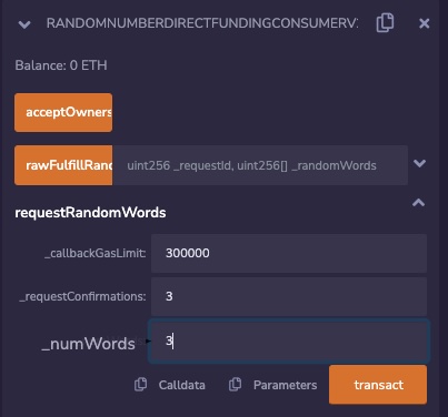 2. In requestRandomWords, fill in _callbackGasLimit with 300000, _requestConfirmations with 3 and _numWords with 3.