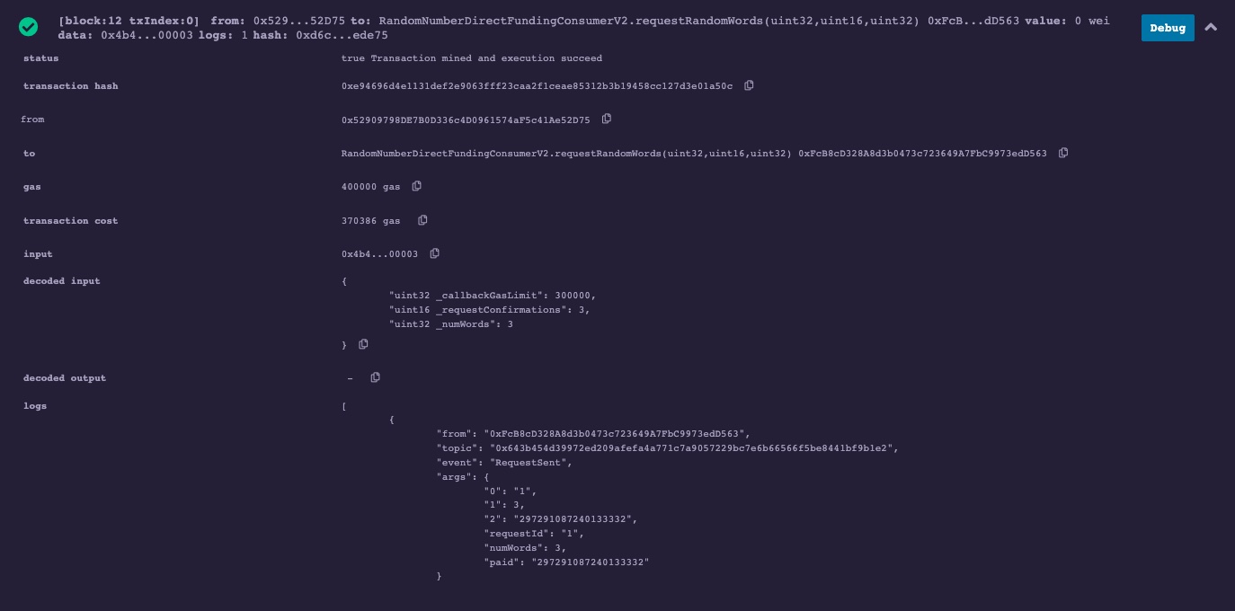 This guide explains how to test Chainlink VRF v2 on a Remix IDE sandbox blockchain environment. Note: You can reuse the same logic on another development environment, such as Hardhat or Truffle. For example, read the Hardhat Starter Kit RandomNumberDirectFundingConsumer unit tests.