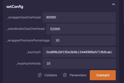 2. Click on setConfig and fill in _wrapperGasOverhead with 60000, _coordinatorGasOverhead with 52000, _wrapperPremiumPercentage with 10, _keyHash with 0xd89b2bf150e3b9e13446986e571fb9cab24b13cea0a43ea20a6049a85cc807cc, and _maxNumWords with 10. Note on these variables: